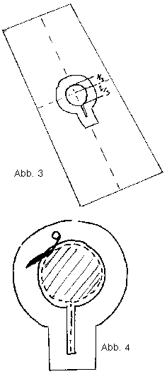 Das "Schlüsselloch" wird auf der Außenseite des Stoffes festgesteckt, wobei 2/3 des Kreises zur späteren Vorderseite mit dem "Bart" nach vorne zeigen (Abb. 4). Danach umnäht man es entlang der Linie und schneidet den Innenteil des Schlüsselloches nicht zu nah der Naht durch beide Stoffbahnen entlang aus (Abb. 4 schraffiert).