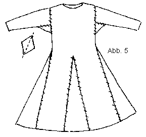 Ein typischer Halsausschnitt, wie im Grundschnitt gezeigt, ist der "Schlüsselloch-Ausschnitt", der oft mit einer Fibel, Brosche oder bei Wikingern auch mit einer Perle als Knopf verschlossen wird. Entweder versäumt man ihn komplett oder verwendet die hier gezeigte Version, um einen etwas steiferen Ausschnitt zu erhalten. Dabei muß der Halsausschnitt vor dem Zusammensetzen angefertigt werden (Abb. 3). Zum Verstärken kann man einen Stoffrest verwenden, auf den man zuerst einen Kreis mit dem Durchmesser des Halsumfanges aufzeichnet (meistens etwa 13 - 17 cm). Auf diesen Kreis wird ein Keil von min. 6 cm Länge gesetzt. Rund um diese Grundform wird 5 cm Stoff zugegeben und das jetzt schlüssellochähnliche Gebilde ausgeschnitten (Abb. 3).