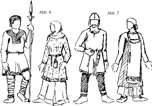 Bis auf kleinere Variationen hatte die Kleidung dieser Zeit sehr ähnliche Schnitte. Es wurden neben den einfarbigen auch gemustert gewebte (Karos, Streifen) und mit einfachen Mustern bedruckte Stoffe verwendet. Wikingerfrauen trugen zusätzlich oft einen Schlauchrock, der mit zwei Broschen befestigt und über den oft eine Art Schürze getragen wurde.