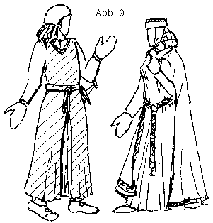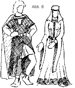 Zu dem Gewand kann man noch verschiedenste Accessoires tragen: Gürtel mit Gürteltaschen und Beuteln, Stirnreifen, Schmuck oder ein Messer für das Essen. Und natürlich gibt es als wichtiges Kleidungsstück den Mantel. Die einfachste Form ist der Rechteckmantel, den es schon in der Bronzezeit und bis zum Ende des 12. Jahrhunderts gab. Er wird normalerweise auf der rechten Schulter mit einer Fibel geschlossen. Weiterhin gibt es die Radmäntel, die aus Teilstücken eines Kreises geschnitten und die auf der Brust geschlossen werden (Abb. 8 und 9).