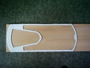 Mit Hilfe der Schablone wird die Lyraform auf die Hartholzplatte (in diesem Fall Buchenleimholz) übertragen.