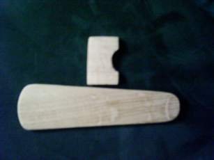 Während der Leim trocknet kann man einen Kasten Bier leeren oder den Steg und den Saitenhalter auf das Brettchen zeichnen und aussägen. Anschließend wird der Steg und Saitenhalter mit Raspel und Schleifpapier in Form gebracht.