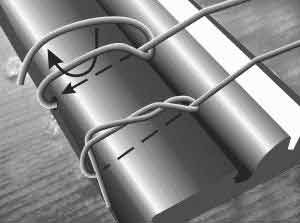 Die Saiten werden im Saitenhalter und in den Stimmwirbeln wie auf den Abbildungen zu sehen ist verknotet.