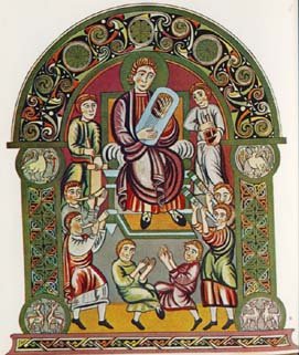 Als Beispiel sei hier die Abbildung von König David im Vespasianpsalter erwähnt. Ich habe mich bei dem Bau der Lyra an einer Abbildung aus dem Buch „Die Ottonen“ und eben der besagten Abbildung aus dem Vespasianpsalter orientiert. Das Ergebnis ist ein Instrument das optisch wie eine Mischung aus beiden Instrumenten aussieht.