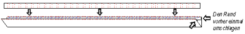 Der ca. 55 cm lange Leinenstreifen und der 1 m lange Streifen werden jeweils längs genau in der Mitte gefaltet und überbügelt, sodaß der Stoff doppelt liegt.